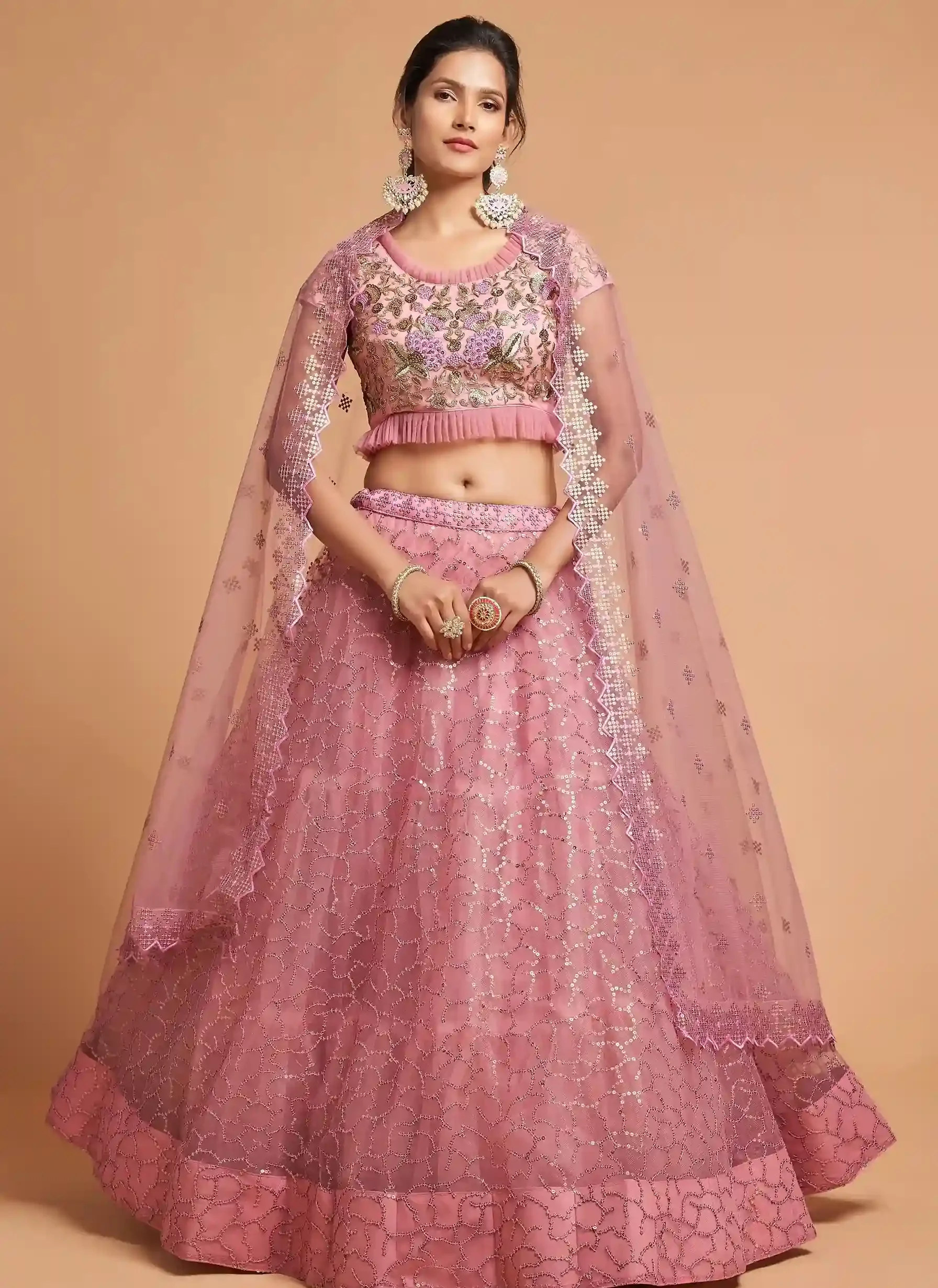 Incredible Dusty Pink Thread Embroidered Soft Net Function Wear Lehenga Choli